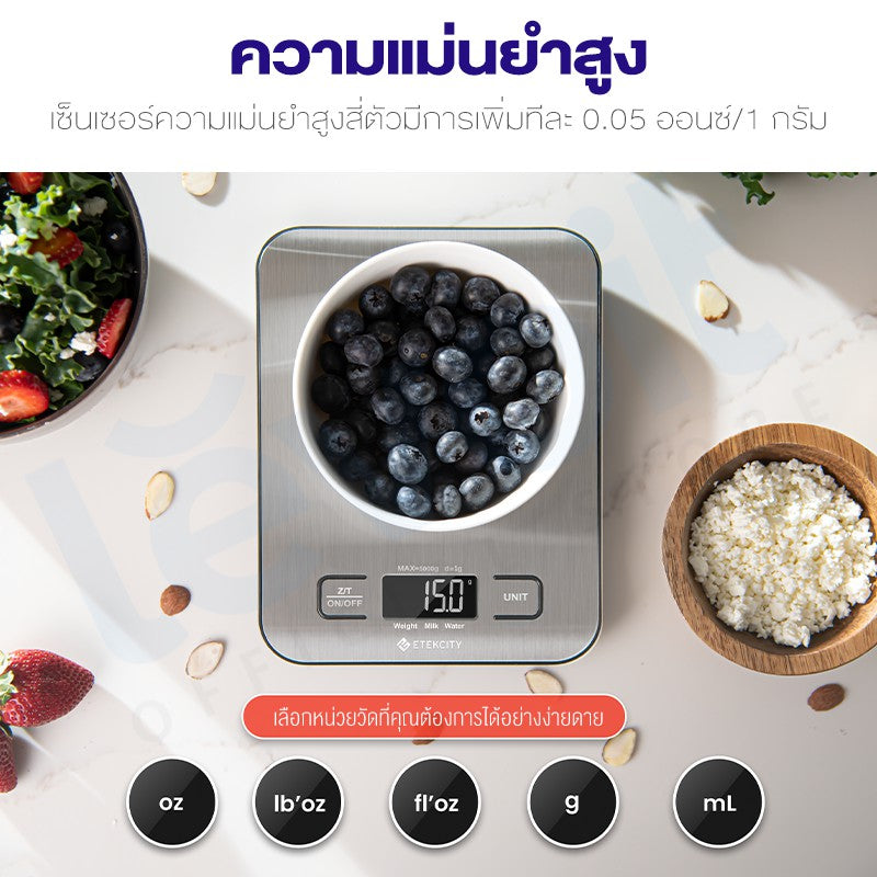 ความจุน้ำหนัก : เครื่องชั่งสามารถชั่งน้ำหนักวัตถุได้อย่างแม่นยำถึง 176 ออนซ์ / 11 ปอนด์ / 5000 ก. / 5000 มล.